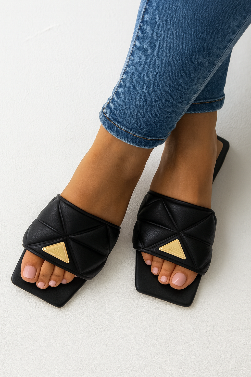Elegancia que no pasa desapercibida. Nuestra sandalia plana Black Glam combina la sofisticación del negro con un detalle dorado icónico, logrando una pieza versátil que eleva cualquier outfit. Su diseño acolchado con textura geométrica no solo aporta estilo, sino también una comodidad única para que camines con seguridad y glamour todo el día.